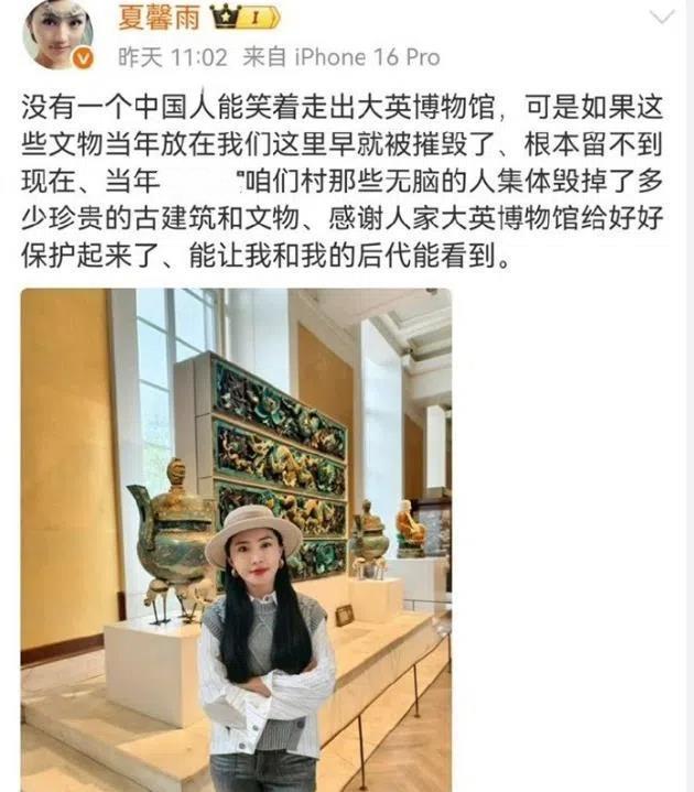 但有个东说念主却有着另类的办法,就在近日,一位名叫夏馨雨的著名女星在辘集上发表“反华言论”,宣称大英博物馆是在“保护”文物,否则中国的文物沿途都被侵略了。