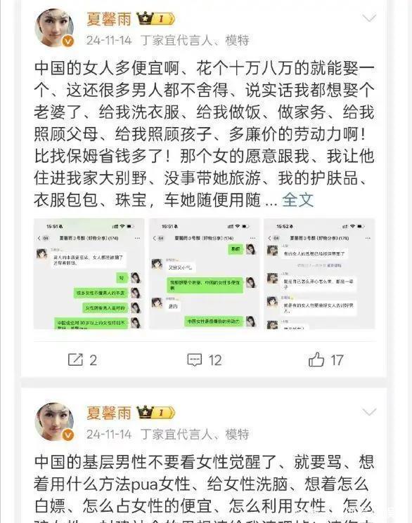 除了力挺劣迹艺东说念主外,夏馨雨最心爱在辘集上挑起男女对立,2024年,她就发文称中国女东说念主给个十万八万就能娶回家,可尽管如斯,好多男东说念主如故舍不得,诸如斯类的话她说了好多。