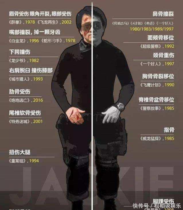诚然成龙并莫得对外展示过他身上的伤疤,但从拍电影时披表示的音信来看,成龙的身上,约略率是伤疤累累。