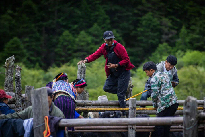 过程数小时的寻找、驱赶,山巅之上几百头牦牛啃食草皮、昂首发愣、彼此嬉戏……在牧民吆喝声中,牛群穿过树林,踏过草地,沿着展望阶梯一齐下山,井然有条牛栏,安稳的牧场眨眼间就侵扰起来。