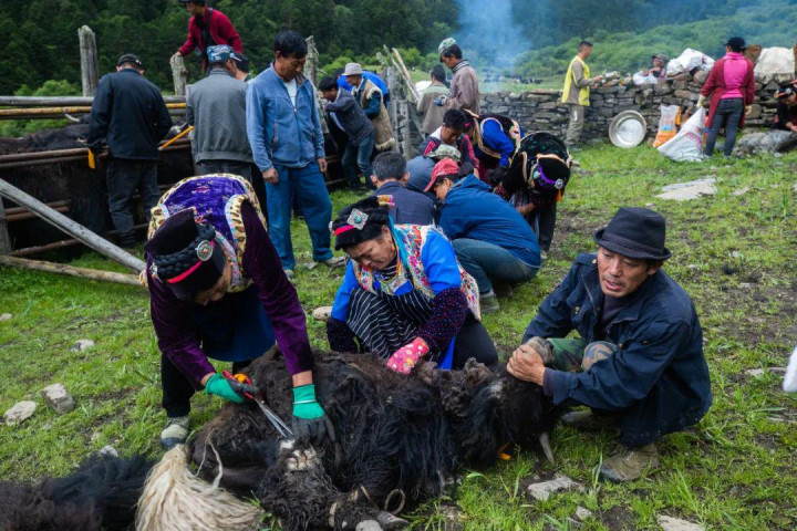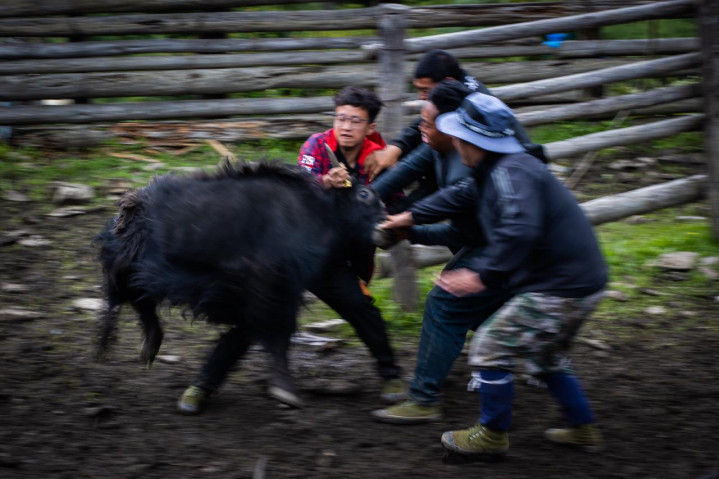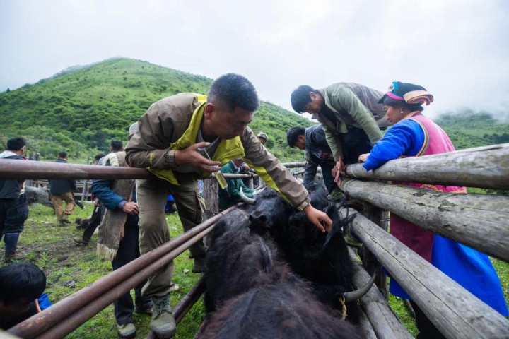 拽牛角、撇毒头、拖牛尾,在男东说念主们的吆喝声中,牛栏内部的牦牛被一头头按到地上;妇女们拿出剪刀,初始为牦牛剪去壮健的牛毛;男东说念主们接着为牦牛打驱虫针、严防针,在牛角上烙上新符号、在耳朵上拴绳索……三下五除二,微辞的牦牛眨眼间变得精神起来。