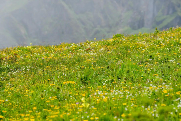 一年一次的剪牦牛毛收尾,峻岭牧场迎来一年中最好意思的季节。远方的冰雪还未消融,漫天盖地开满各色鲜花,也迎来草木最丰沛的季节。过程苦寒的严冬,又到了牦牛“大快朵颐”,速即长膘的本领。